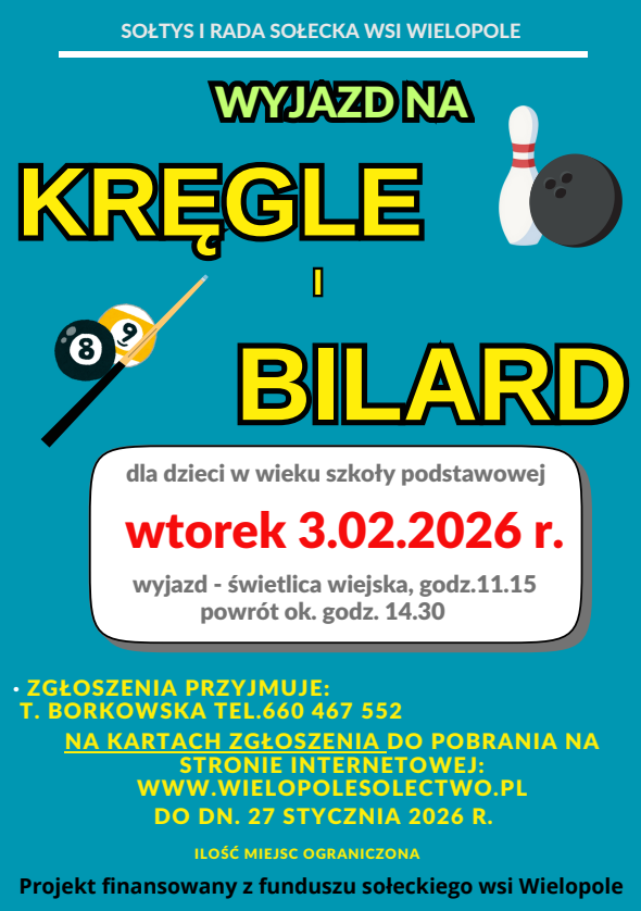 Wyjazd na kręgle i bilard dla dzieci w wieku szkoły podstawowej by Sołectwo Wielopole | sty 16, 2026 | Aktualności KARTA ZGŁOSZENIA UCZESTNICTWA DZIEСКА w imprezie: „ZIMOWY WYJAZD NA KRĘGLE I BILARD"