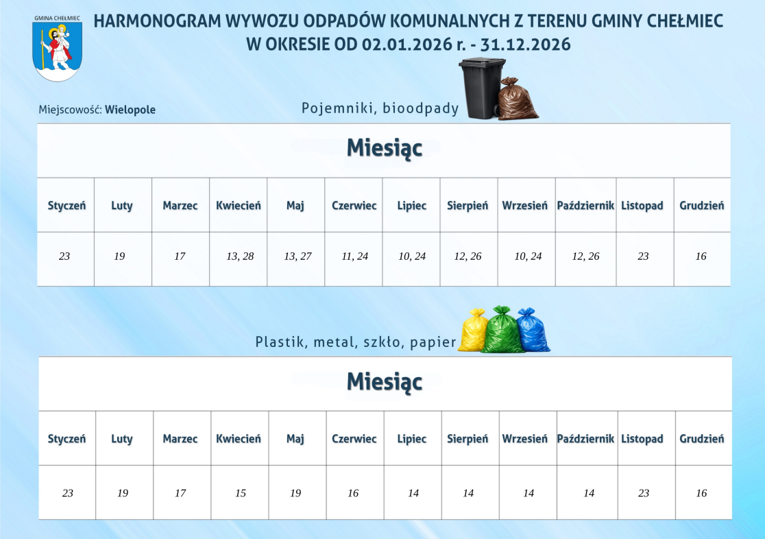 Harmonogram wywozu odpadów komunalnych z terenu gminy Chełmiec w okresie od 02.01.2026 r. - 31.12.2026 Wersja PDF: Harmonogram wywozu odpadów komunalnych z terenu gminy Chełmiec w okresie od 02.01.2026 r. - 31.12.2026